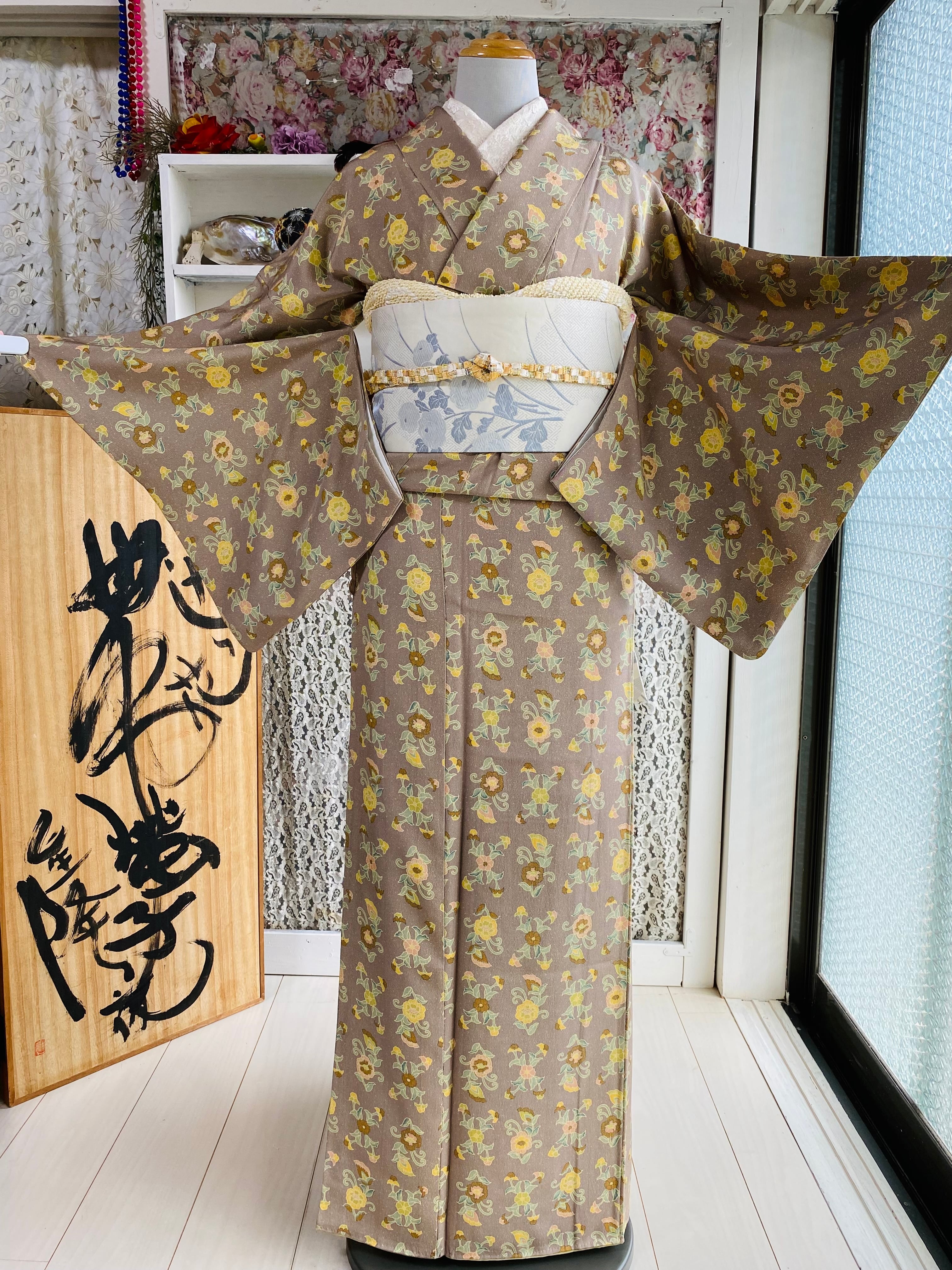 とても可愛らしい花唐草文様が描かれた縮緬小紋です。