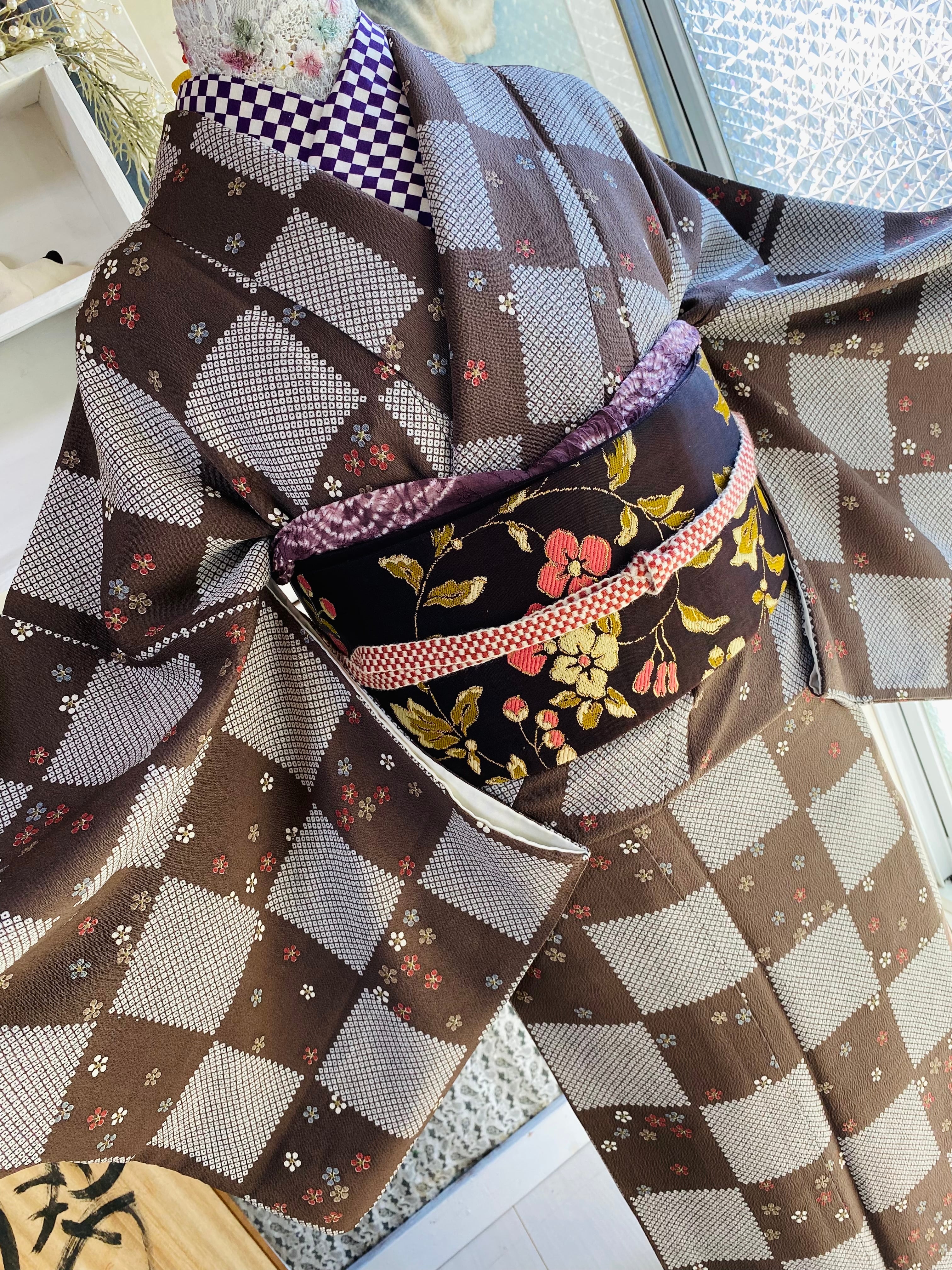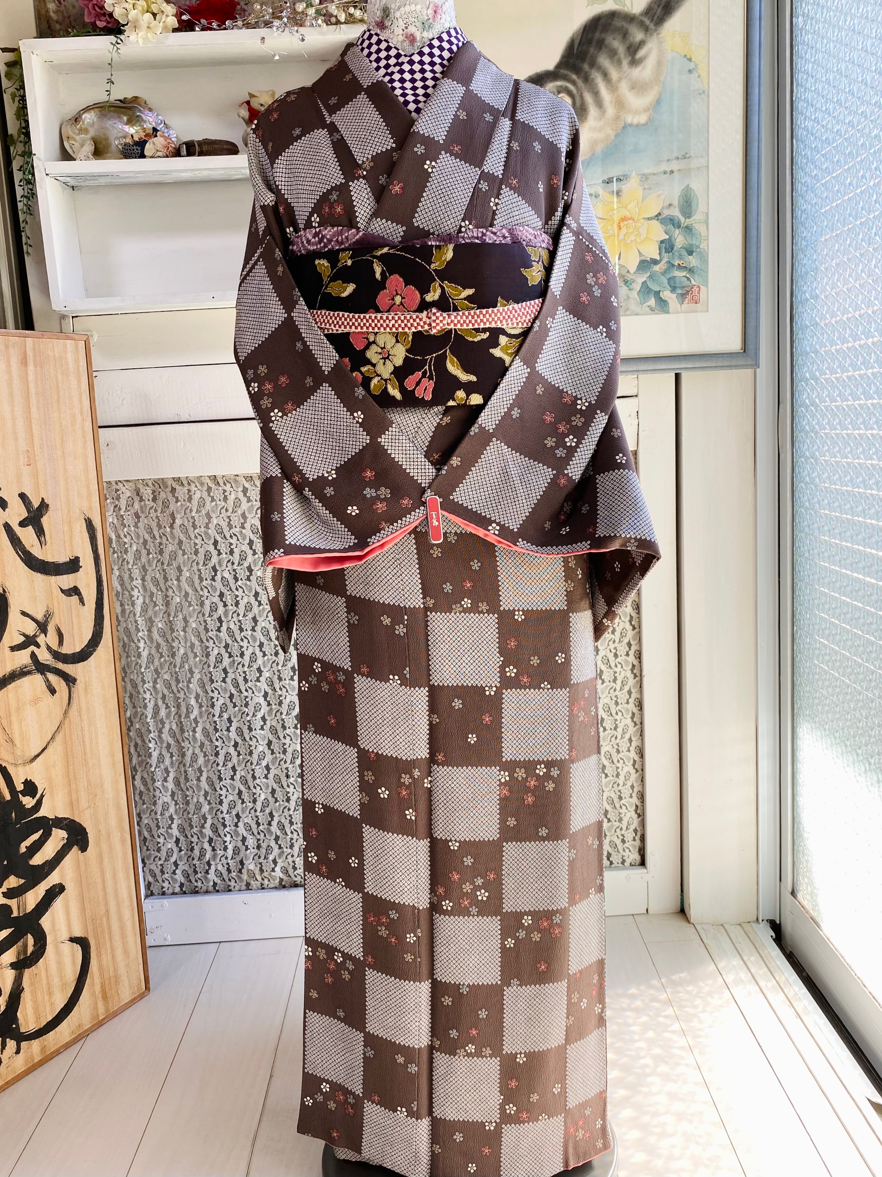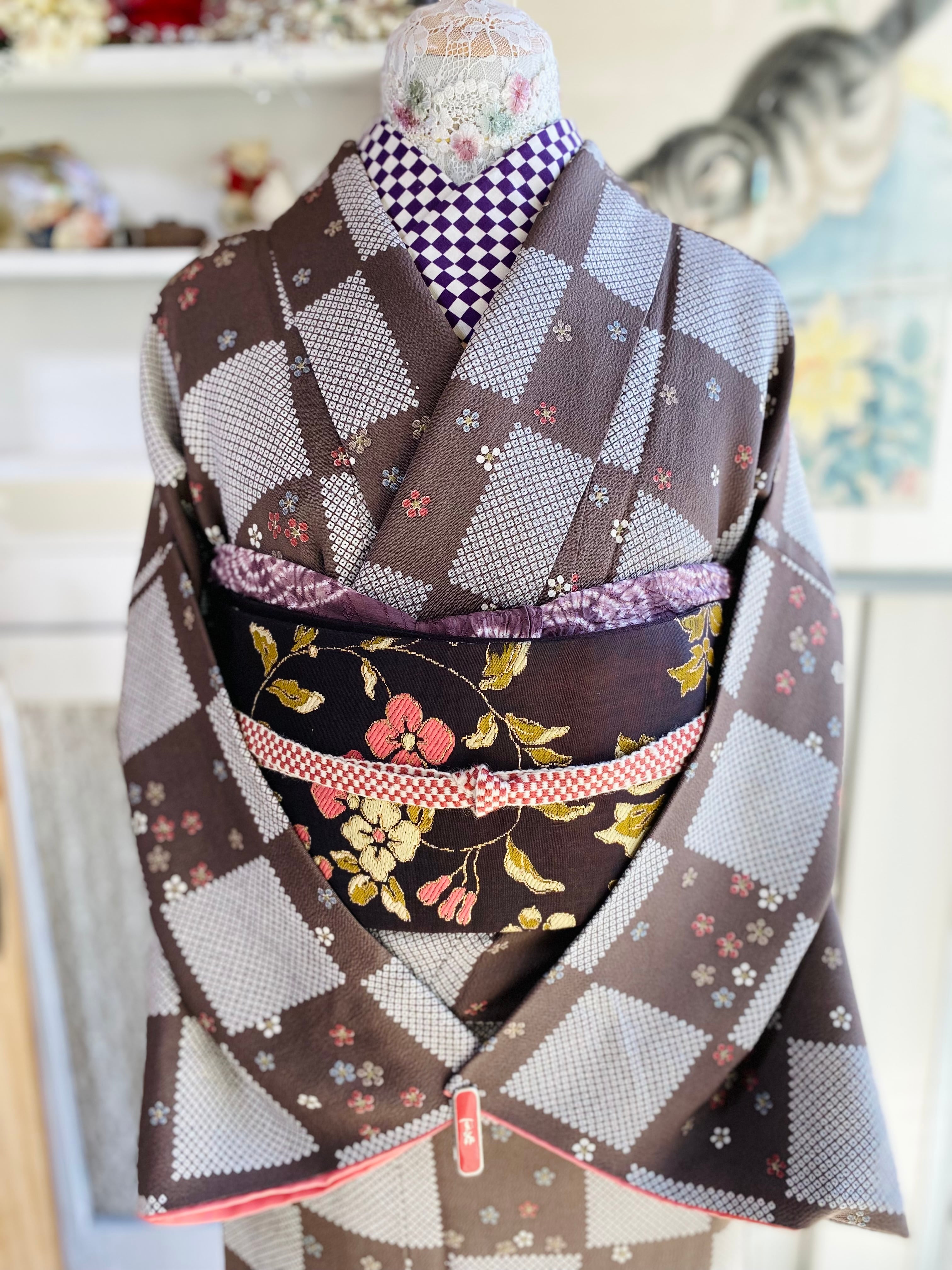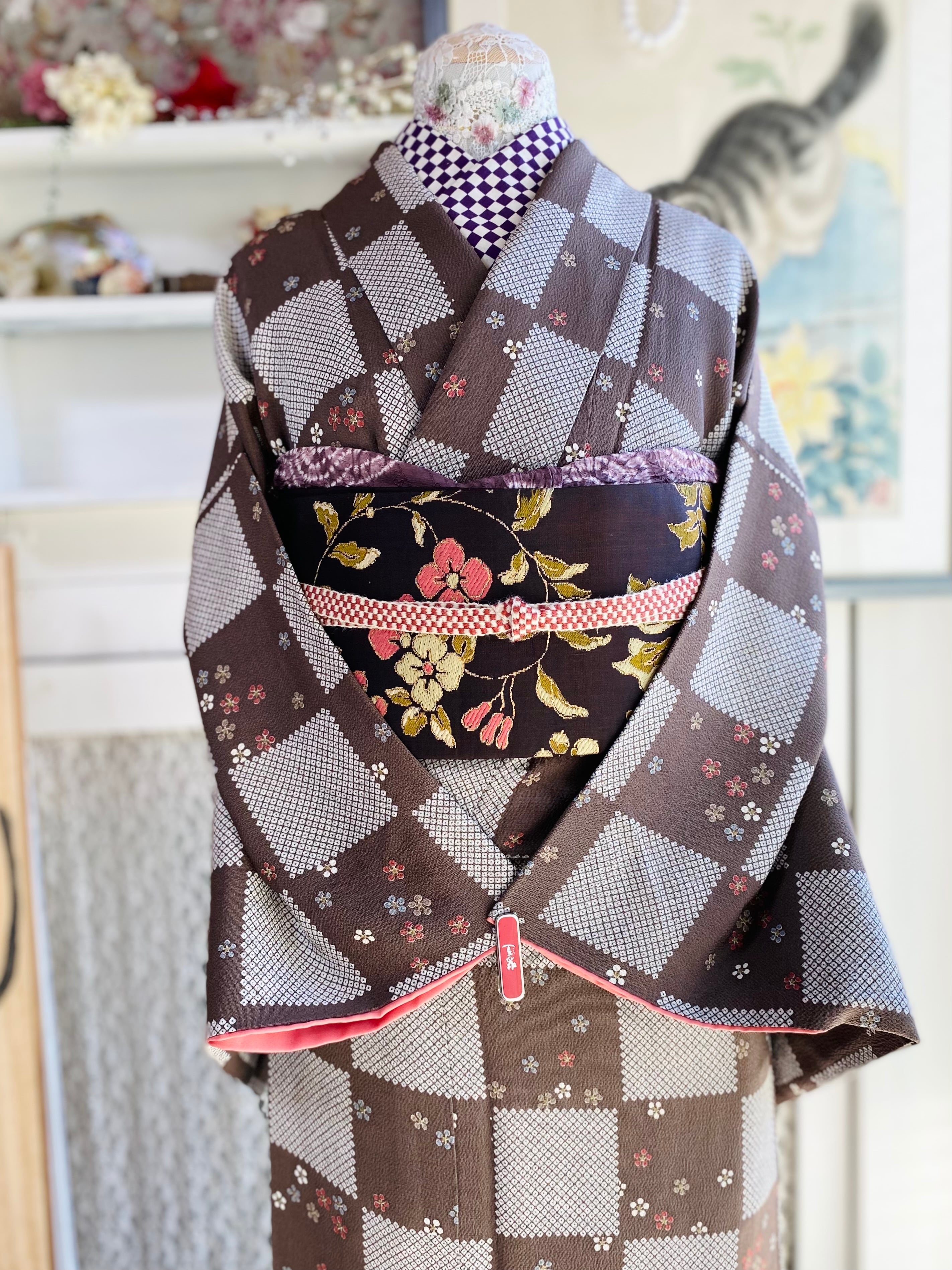 鹿の子で染め出された市松模様。手の込んだ可愛らしい小紋です。