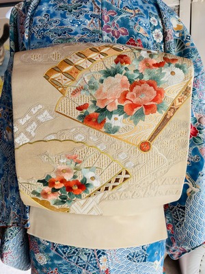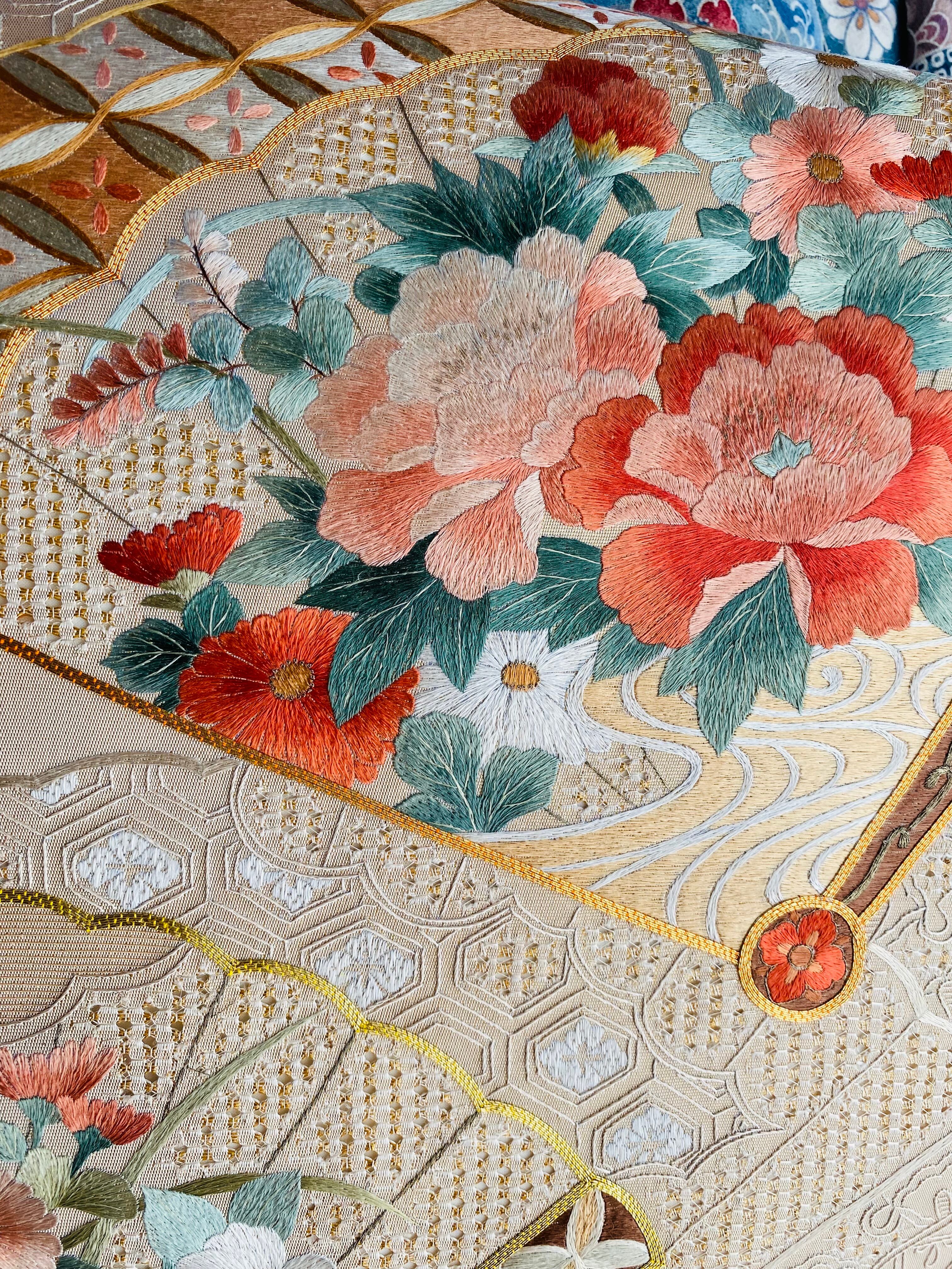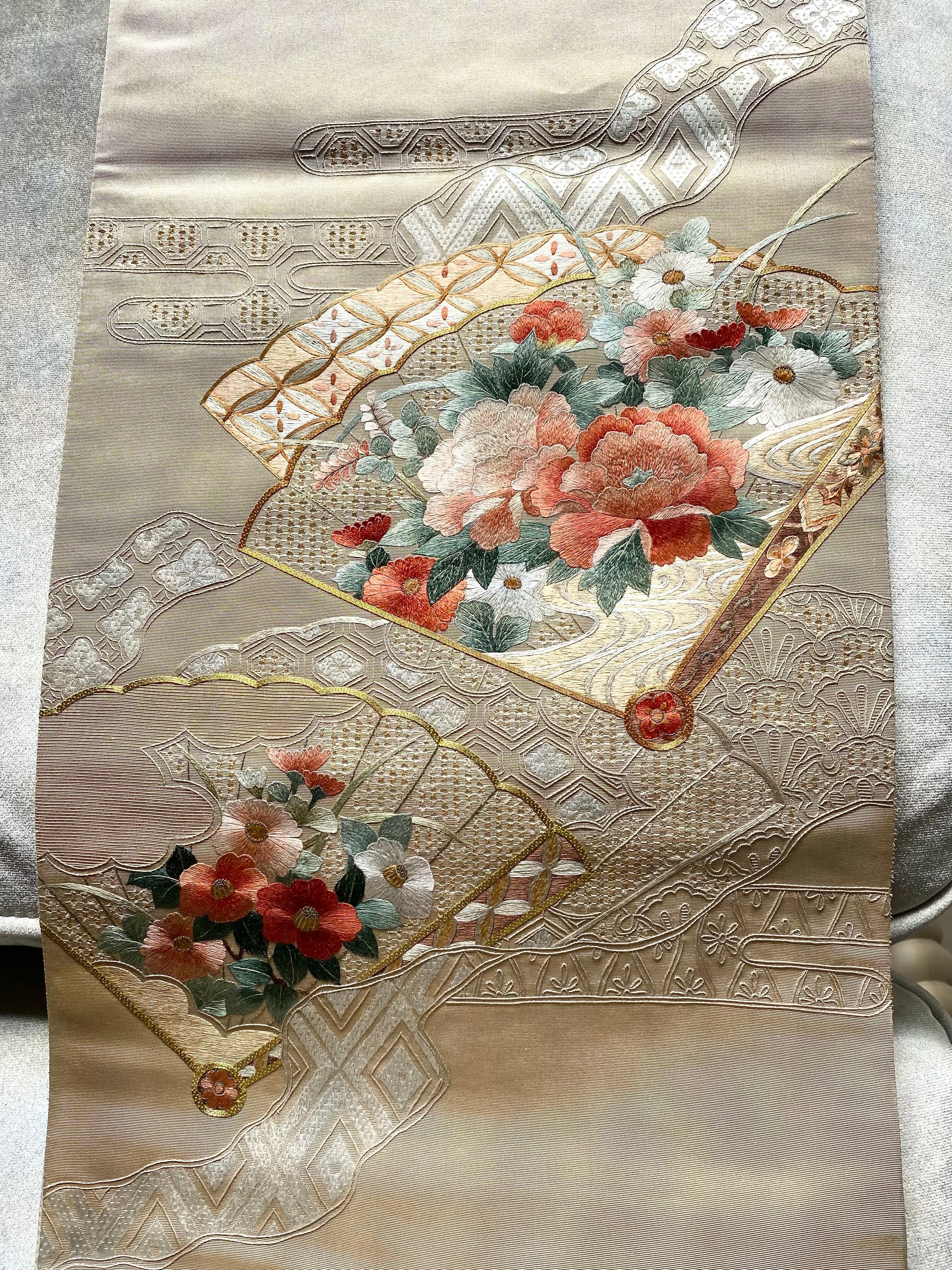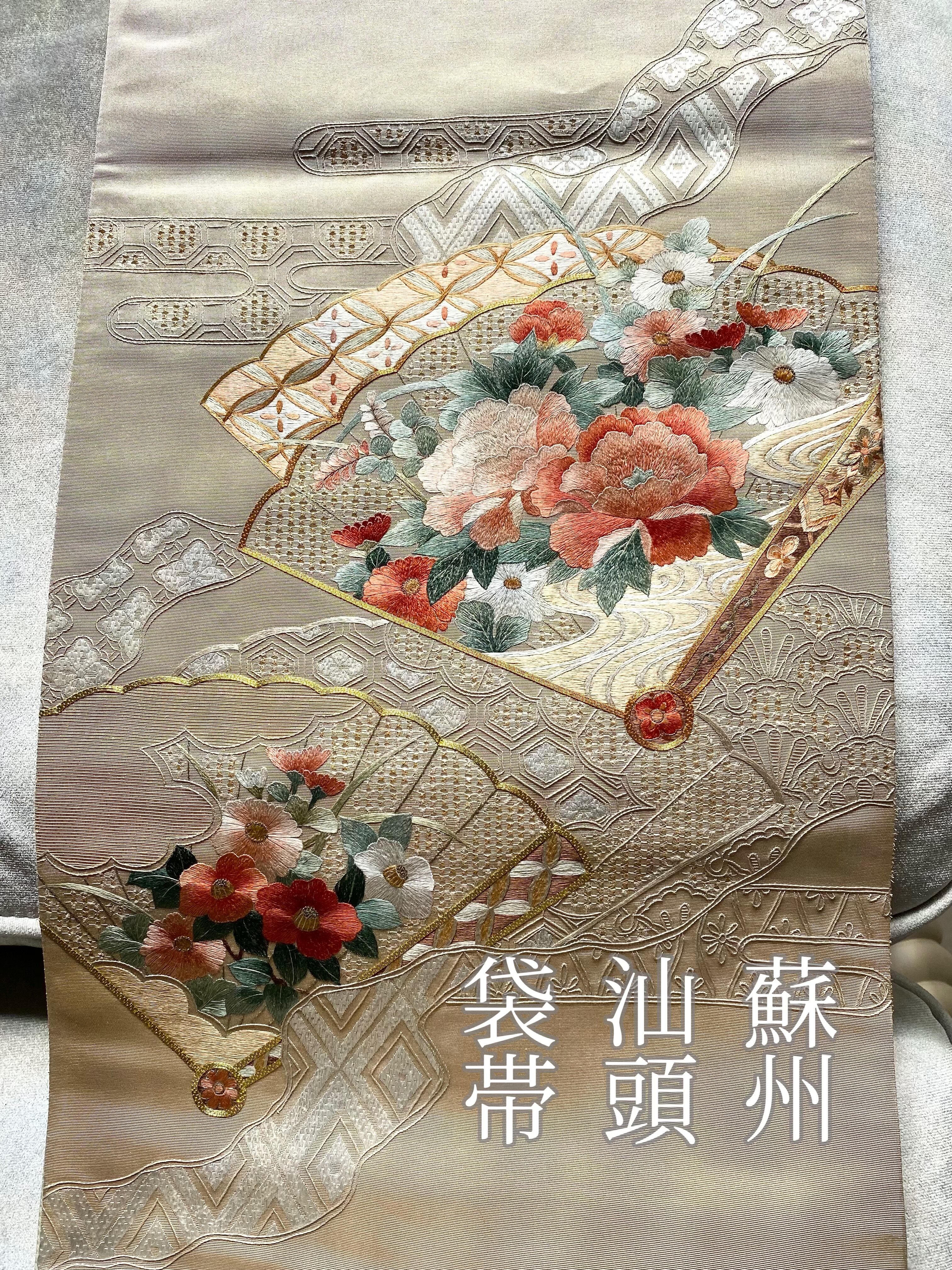 蘇州刺繍と汕頭刺繍 金駒刺繍をほどこされた大変手の込んだ袋帯です。