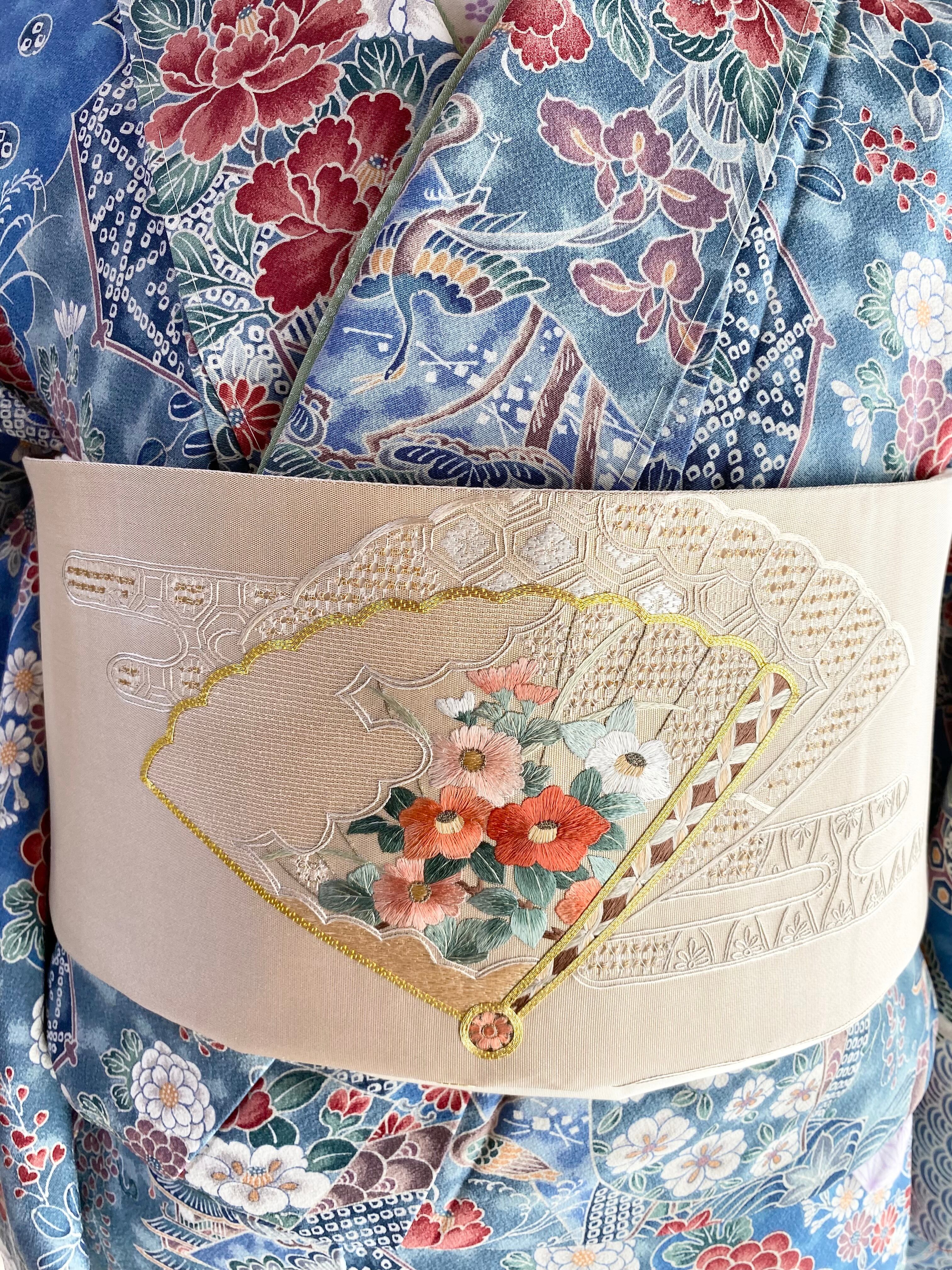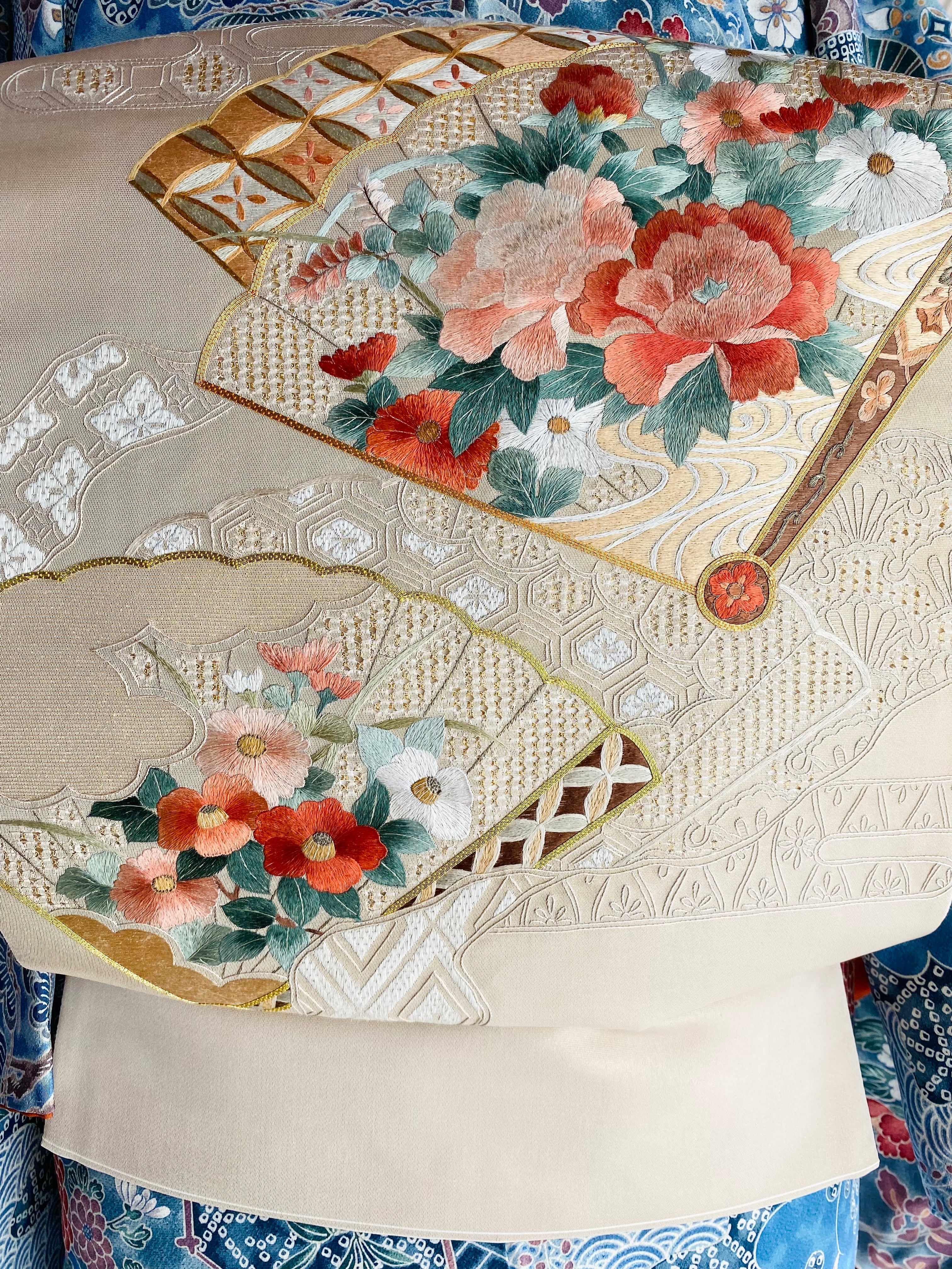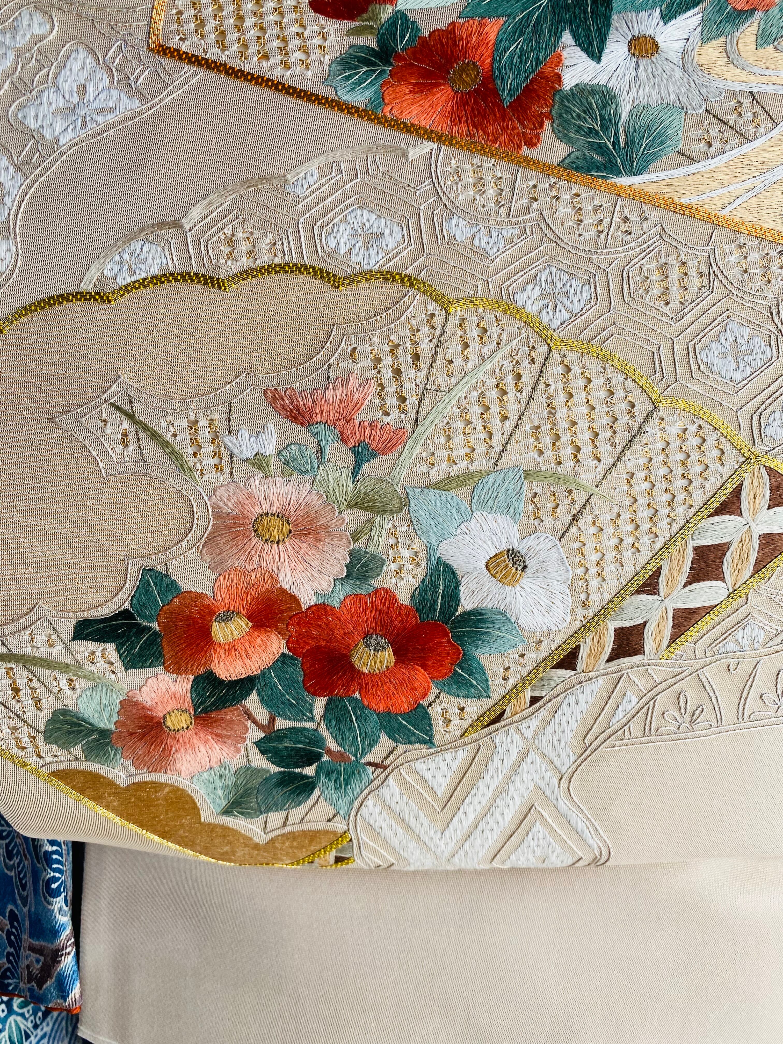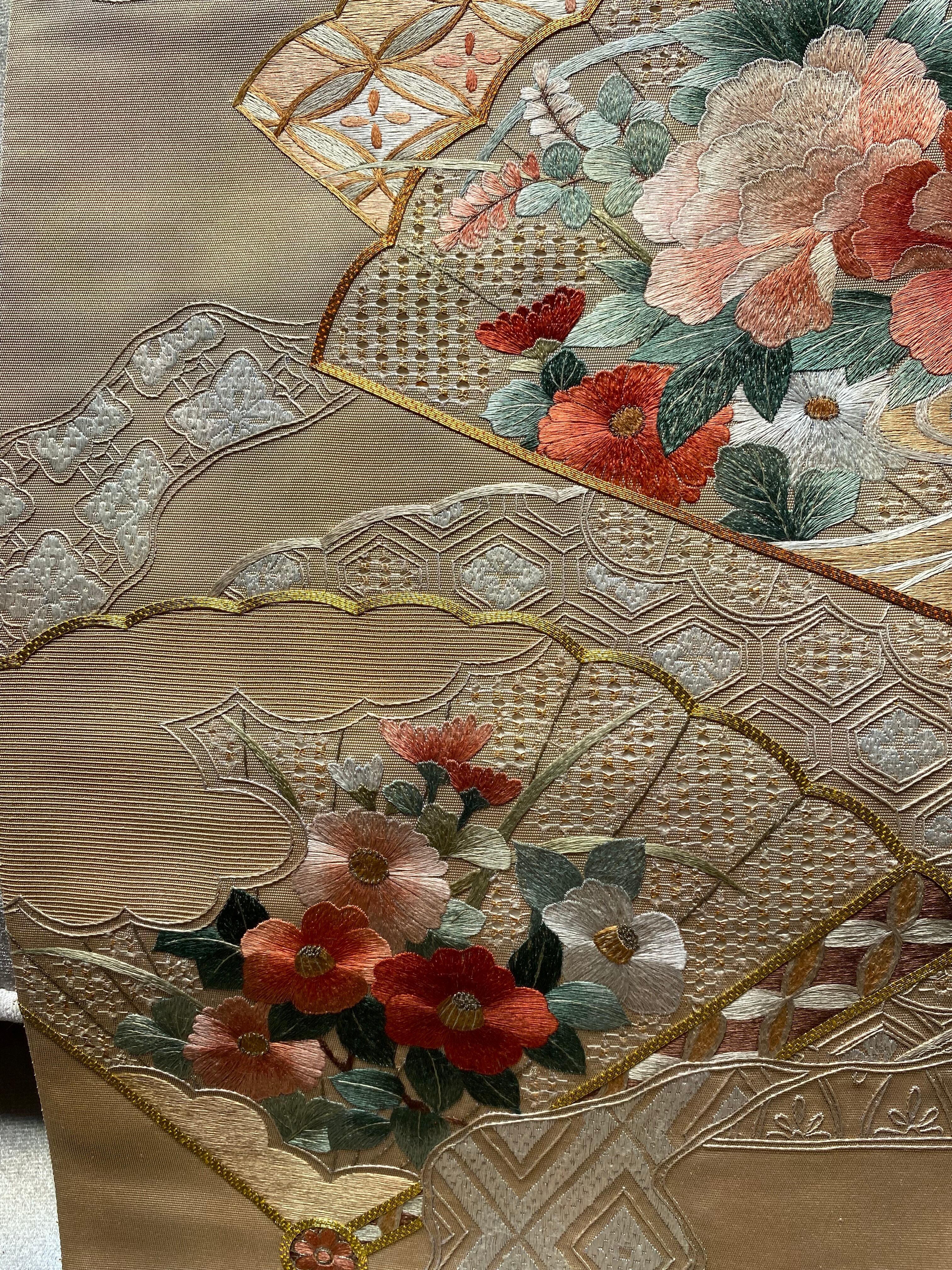 蘇州刺繍と汕頭刺繍 金駒刺繍をほどこされた大変手の込んだ袋帯です。