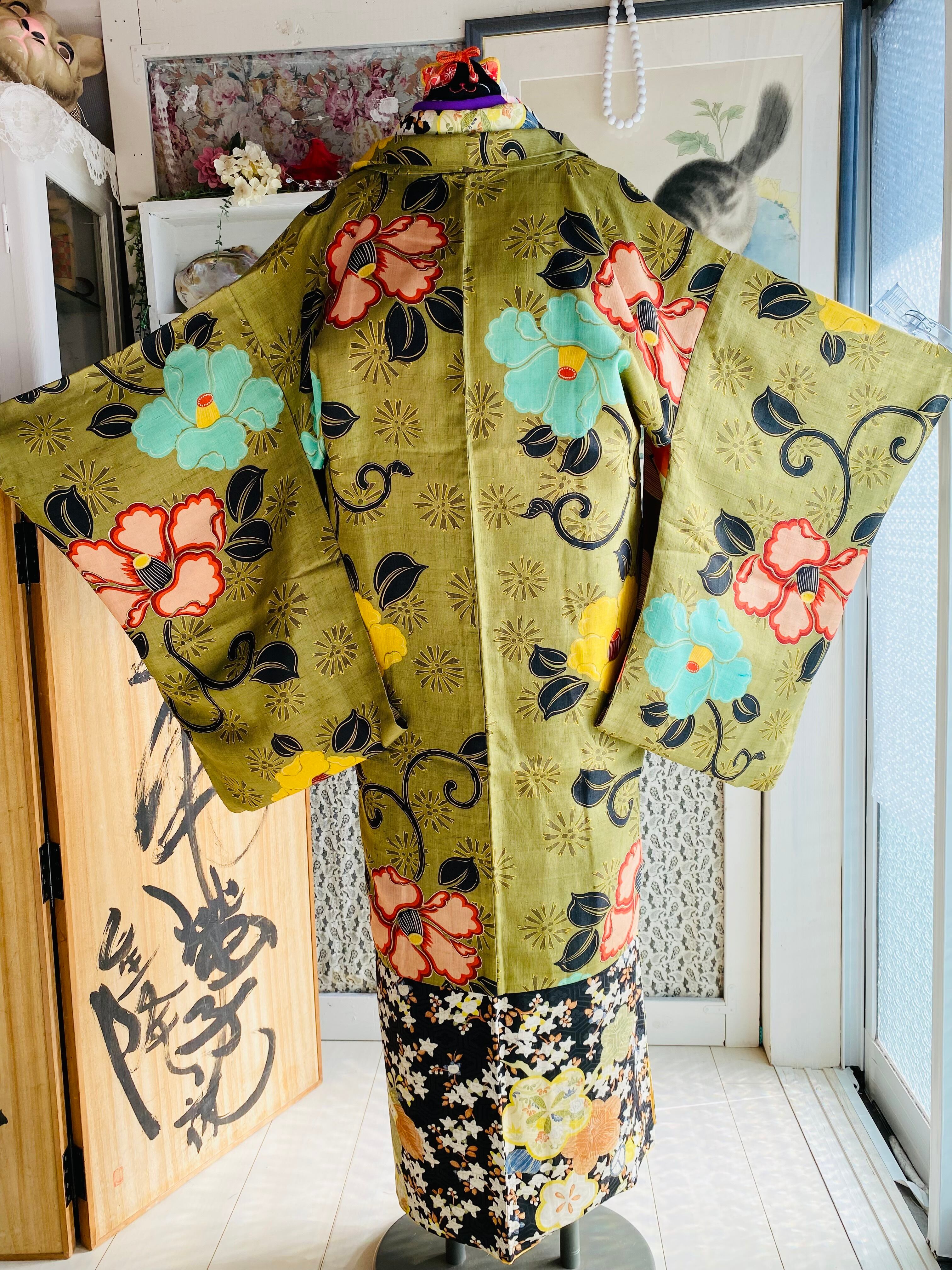 カラシ色の地色の背景には糸菊、そして色とりどりの大きな椿の花唐草が描かれました逸品です。