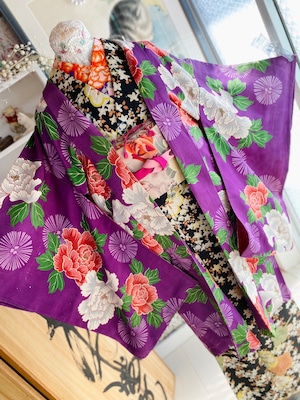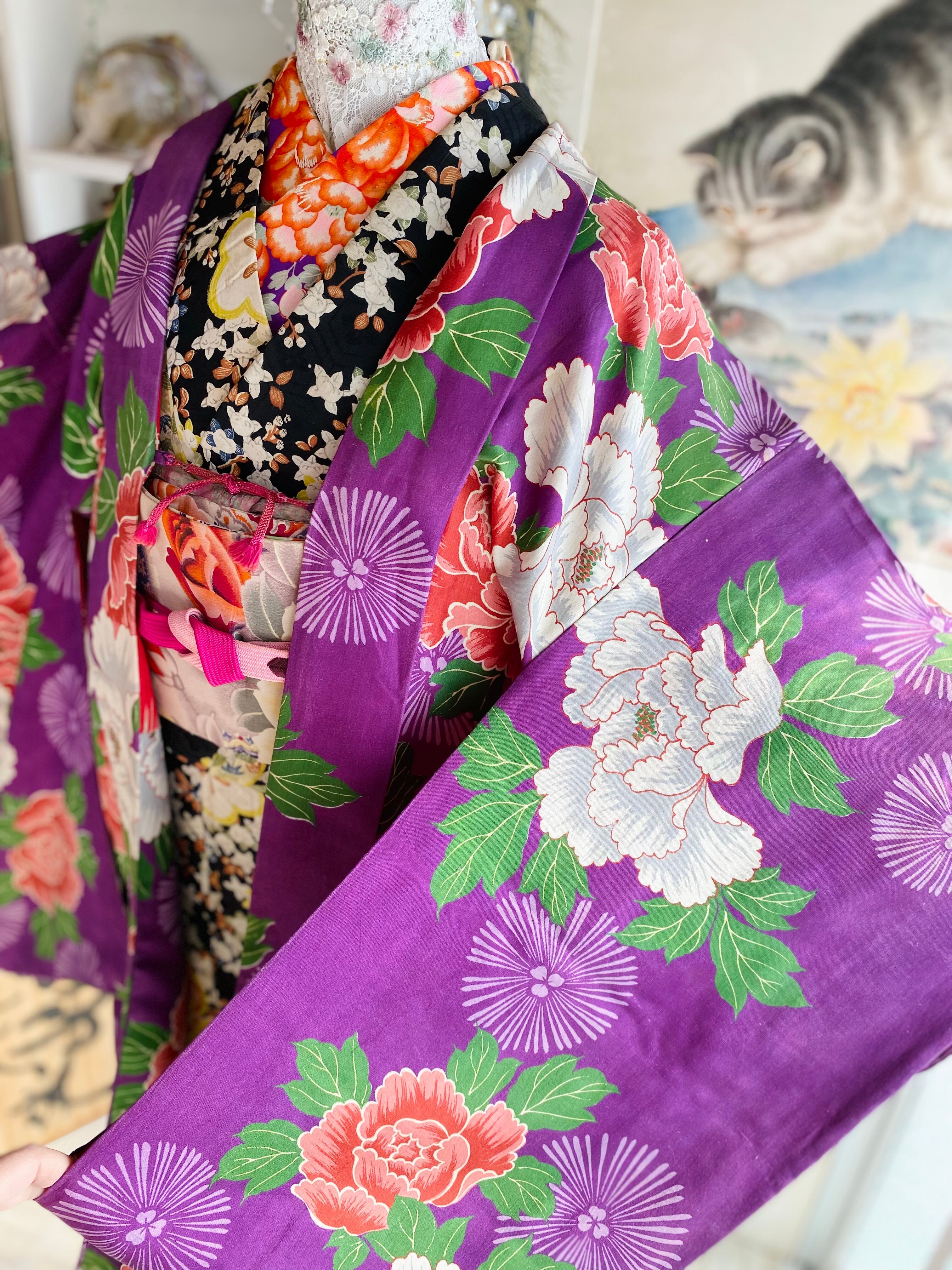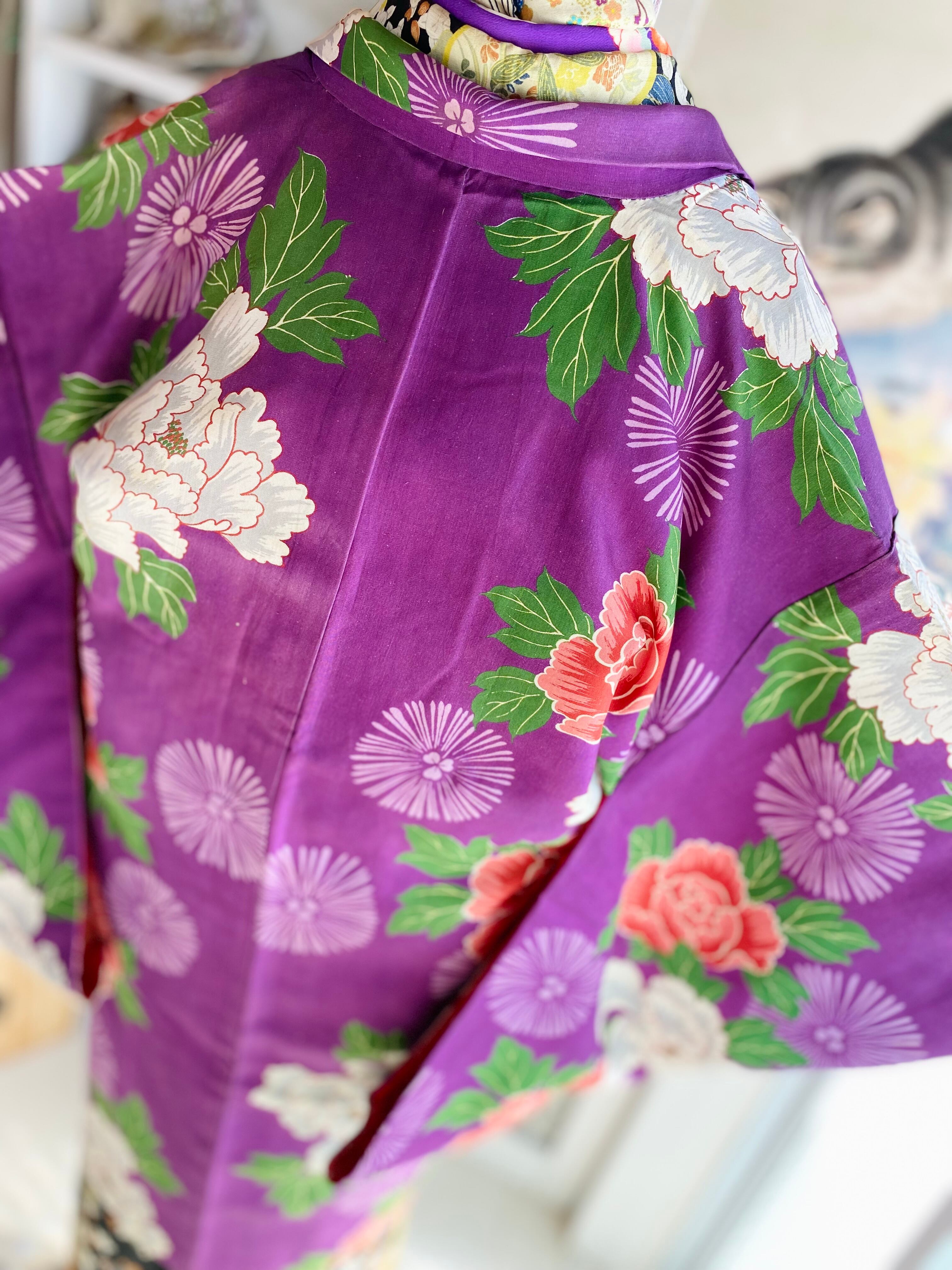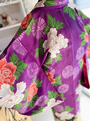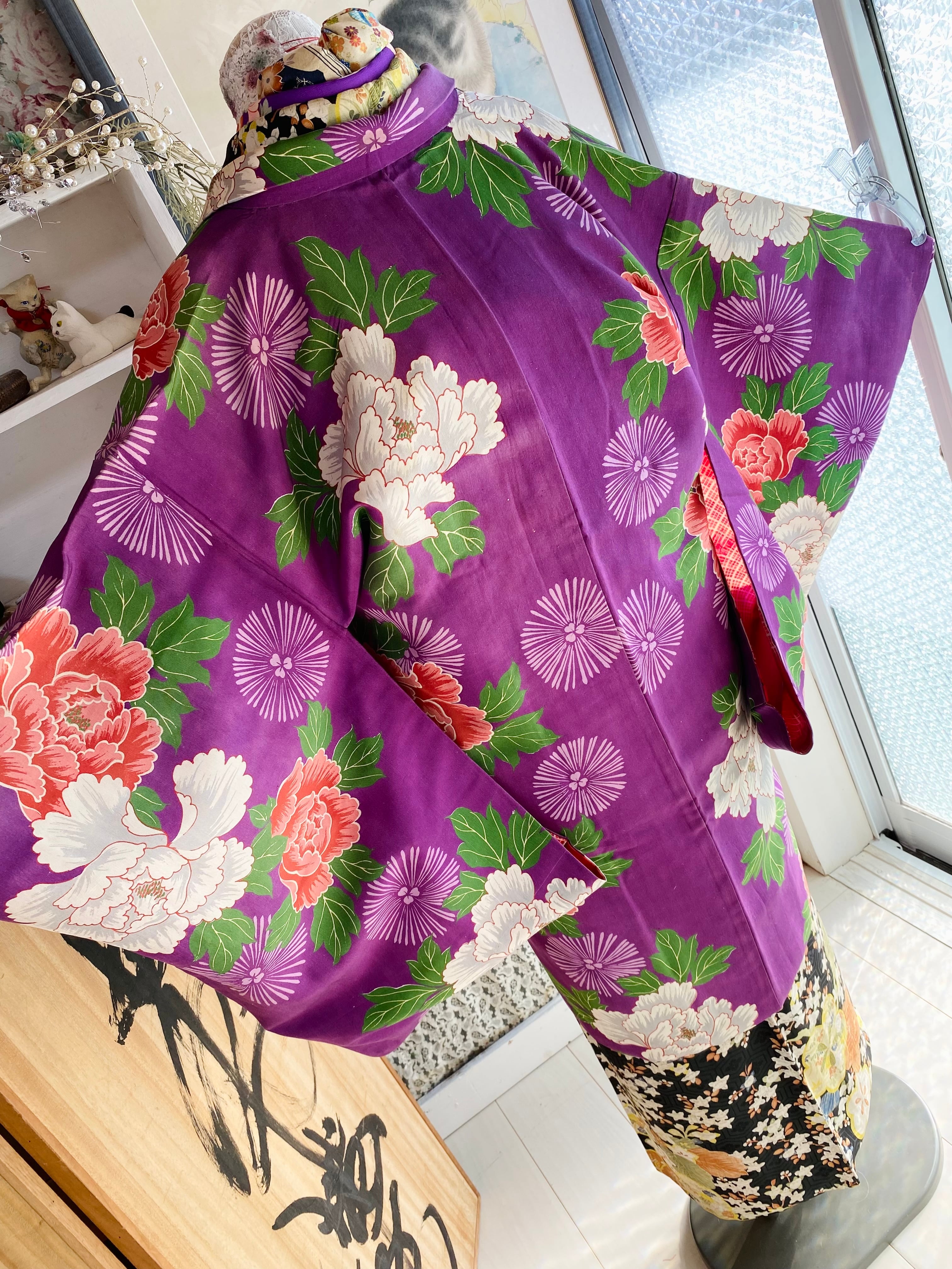 明るい紫色に大きな紅白の牡丹が描かれたとても華やかな長羽織です。間からのぞく糸菊も可愛らしい逸品です。