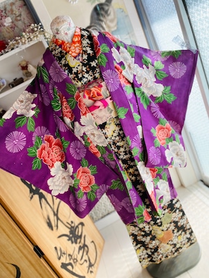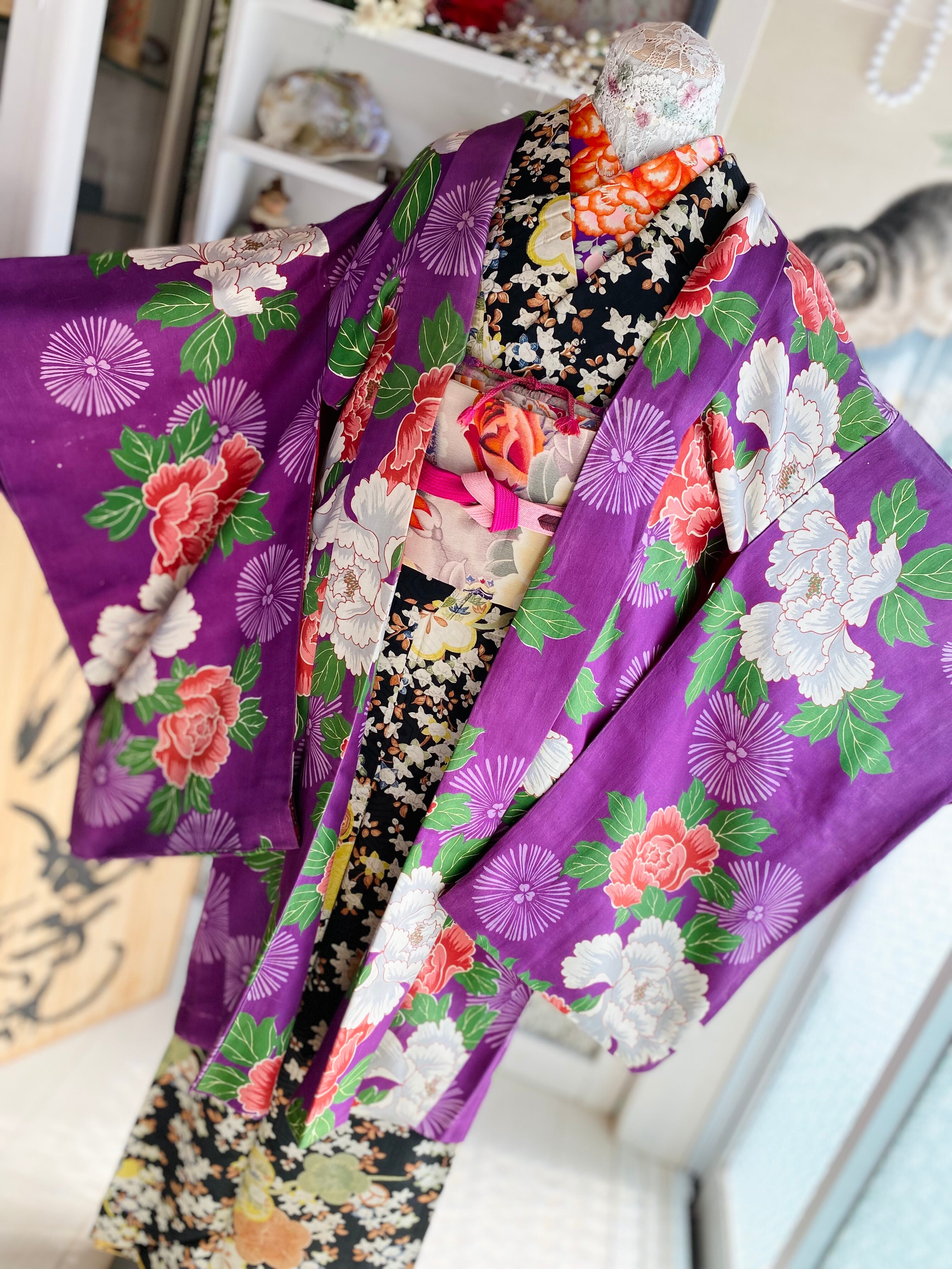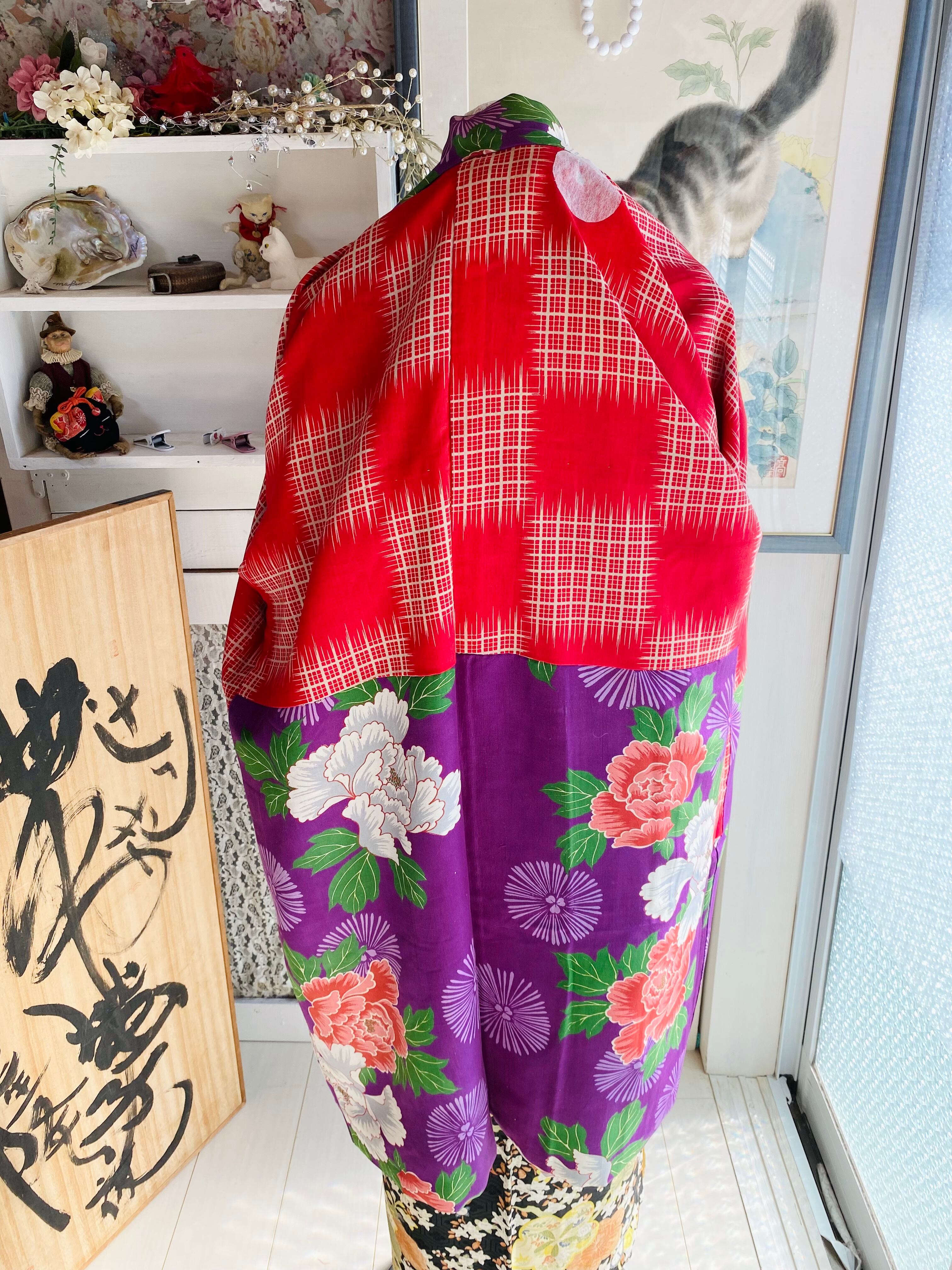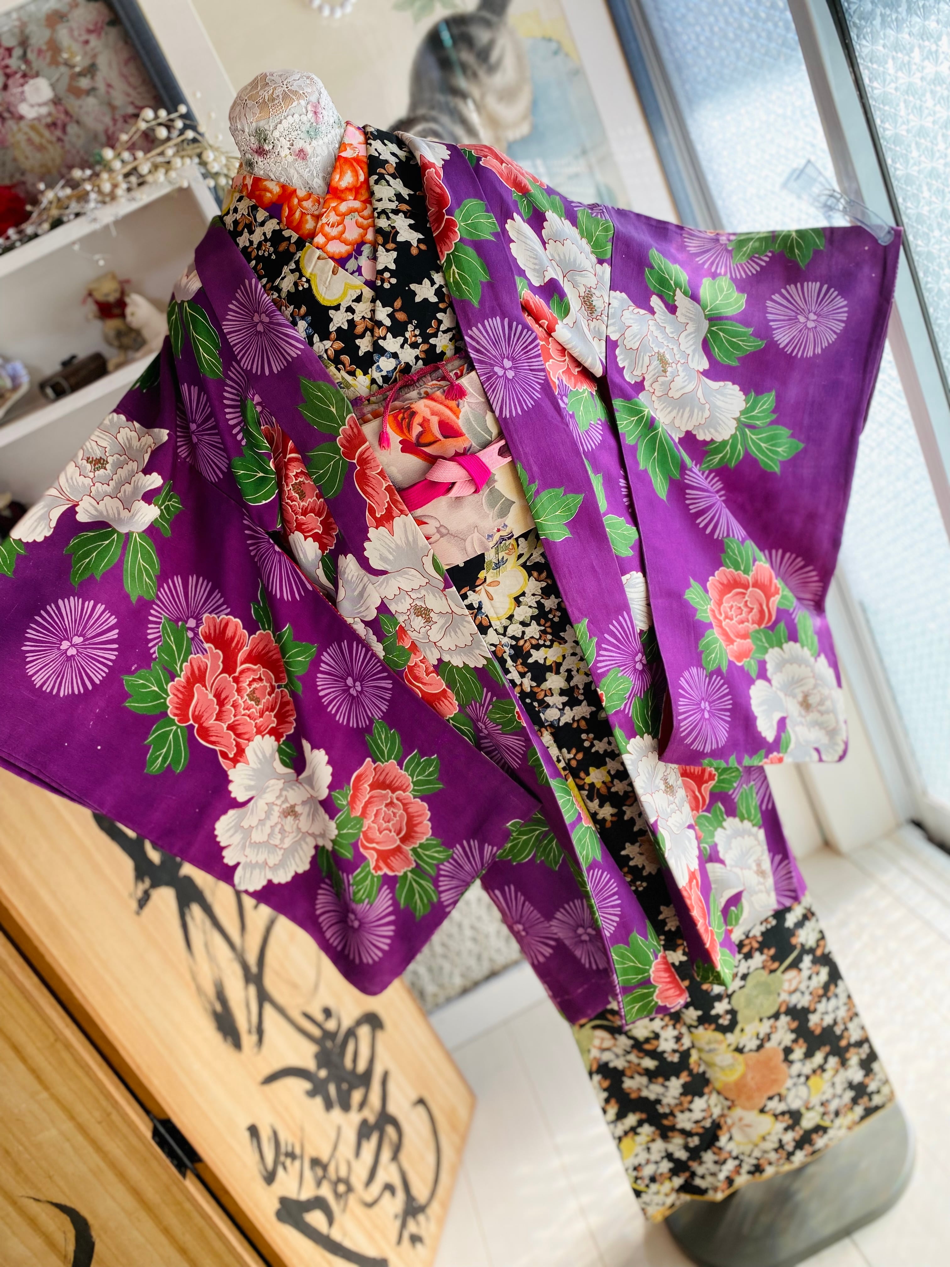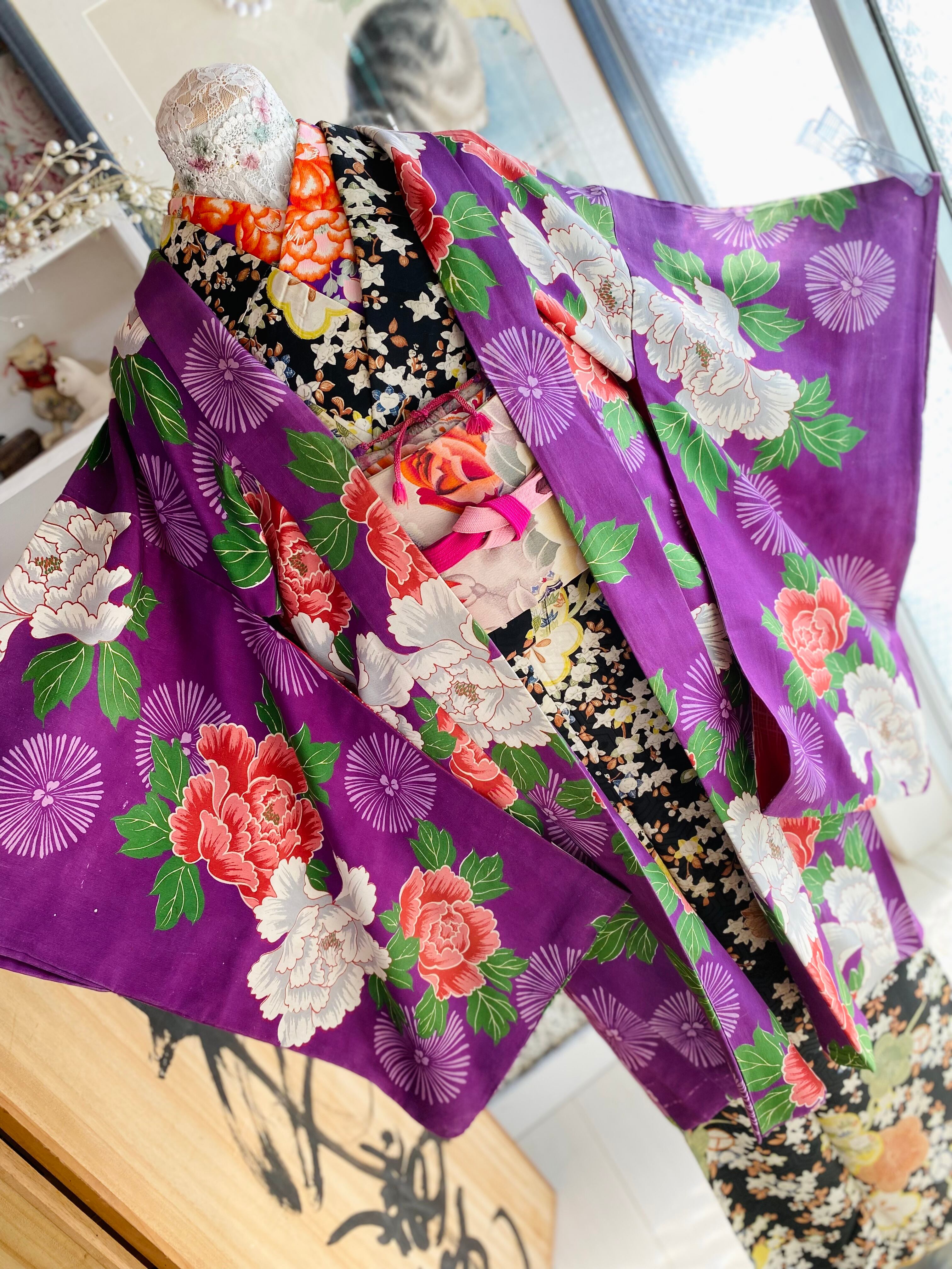 明るい紫色に大きな紅白の牡丹が描かれたとても華やかな長羽織です。間からのぞく糸菊も可愛らしい逸品です。