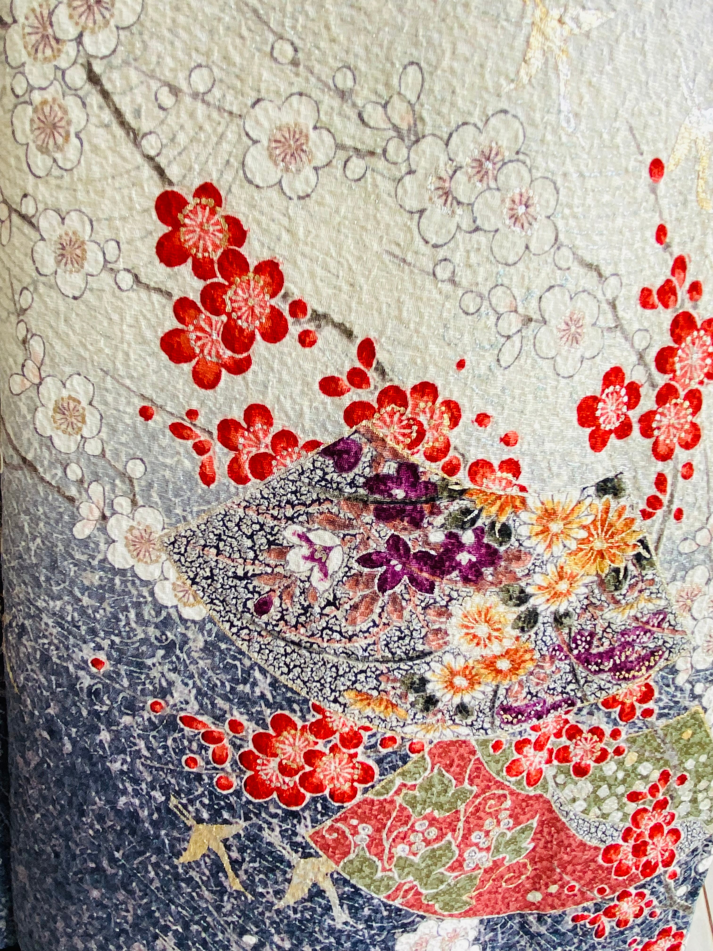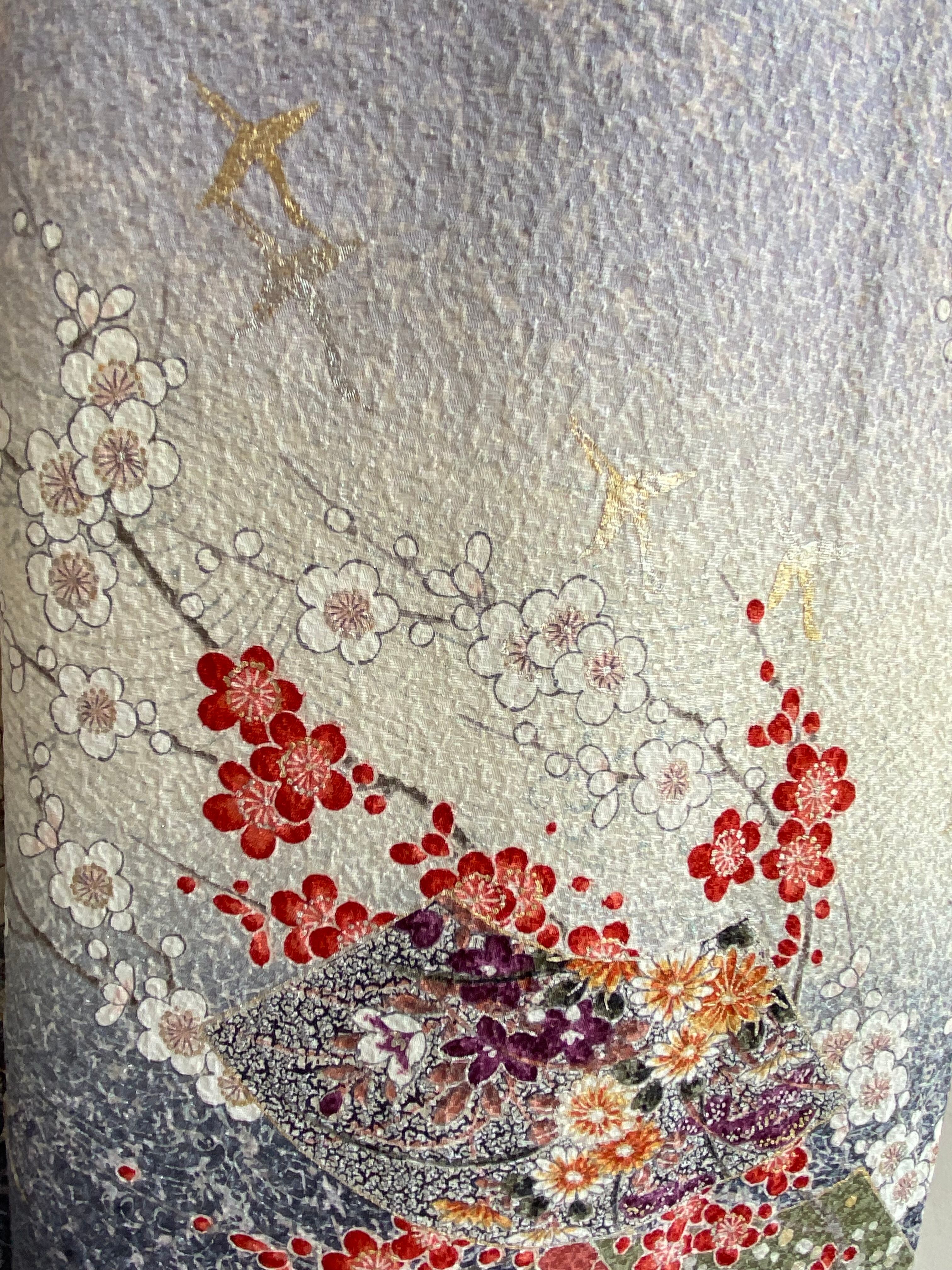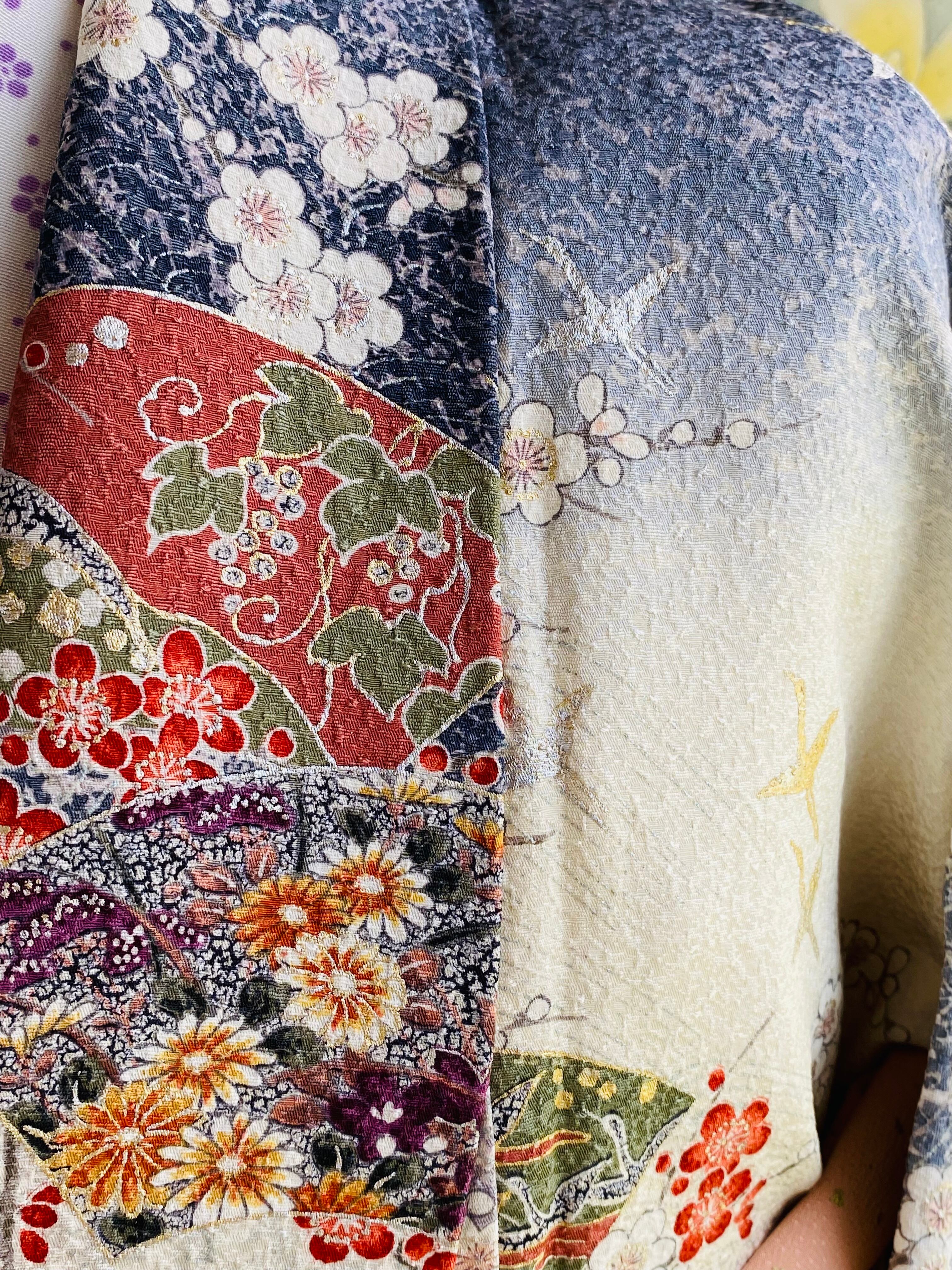 シボのある生地に色とりどりの花と金彩銀彩の鶴が大変煌びやかで品のある小紋です。